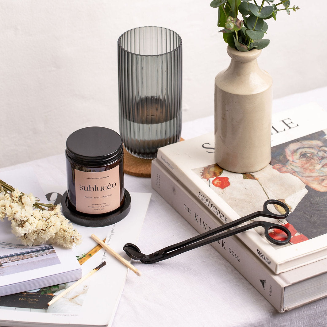 A must have accesory for all candle lovers! Sleek, weighty and matte black. Designed to pro-long the life of your candle. Trim before and after burning, see candle care guide for more info.
