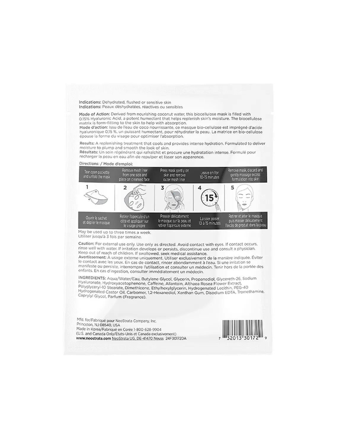 NeoStrata Pure Hyaluronic Acid Biocellulose Mask is derived from nourishing coconut water, this biocellulose mask is filled with 0.15% Hyaluronic Acid, a potent humectant that helps replenish skin's moisture. The biocellulose matrix is form-fitting to the skin to help with absorption. Gentle Formula provides intense hydration. Ideal for dry, sensitive, and normal skin types. Packaged with mesh liner to aid application of the form-fitting biocellulose mask. Results After 1 use*:
