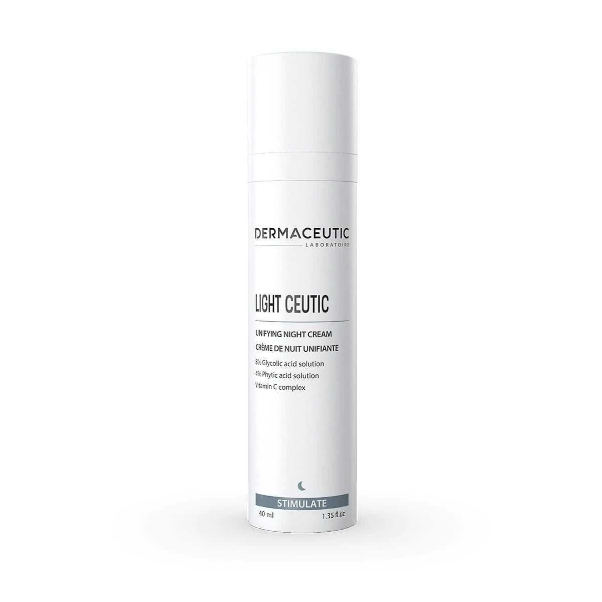 Brighten dark spots and boost skin's radiance with the Dermaceutic Light Ceutic cream. Formulated with a corrective blend of Glycolic Acid, Phytic Acid and Vitamin C, this exfoliating treatment removes dead and discoloured cells from the surface of the skin while effectively minimising the production of melanin, to create a clearer and more even complexion with continued use. Designed to work during skin's most regenerative time, it also tones and firms lacklustre areas, to reveal a more radiant and youthful complexion by morning. Suitable for most skin types, apply to clean skin every evening for best results. Benefits