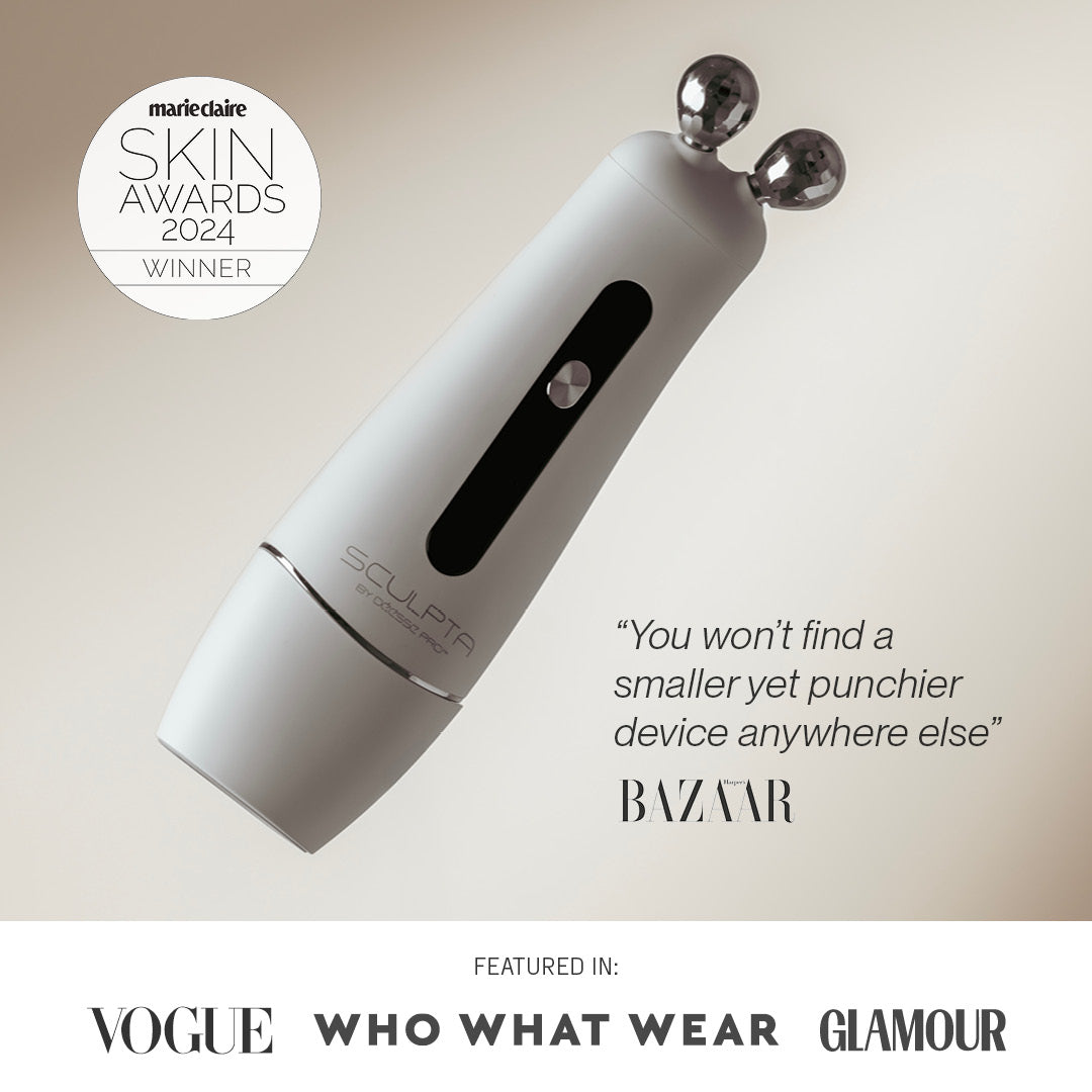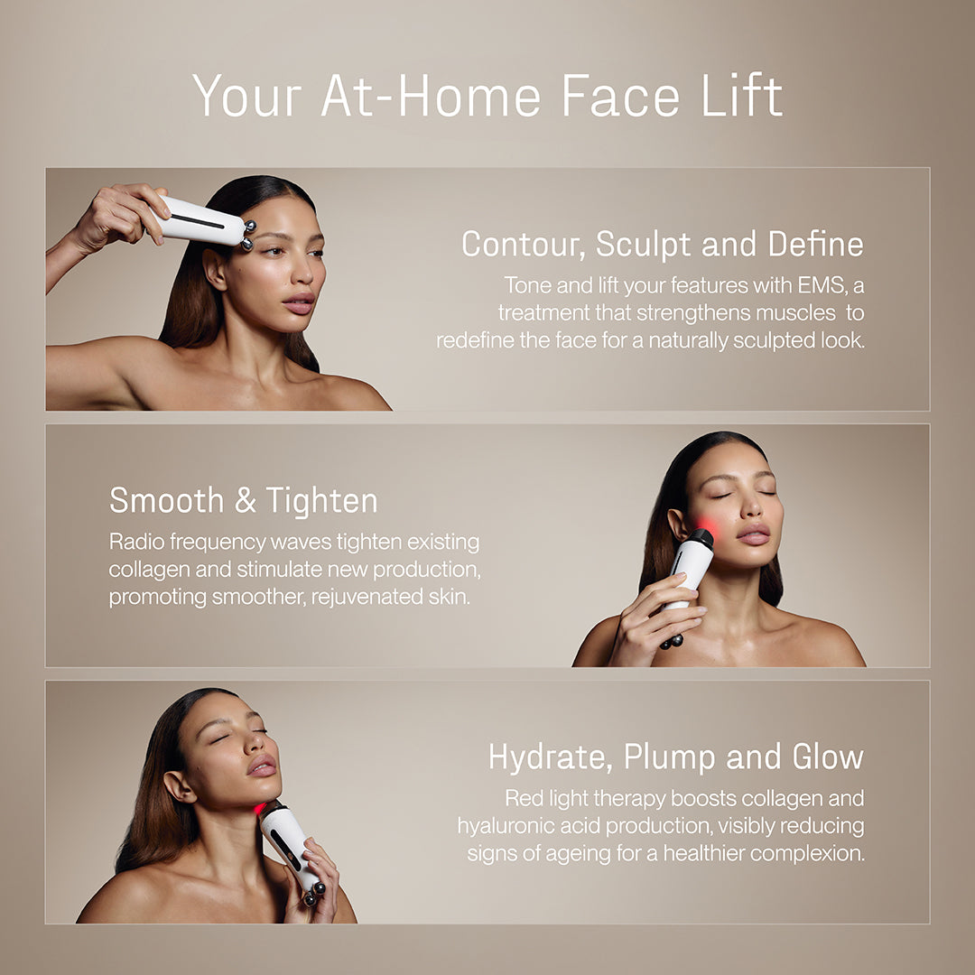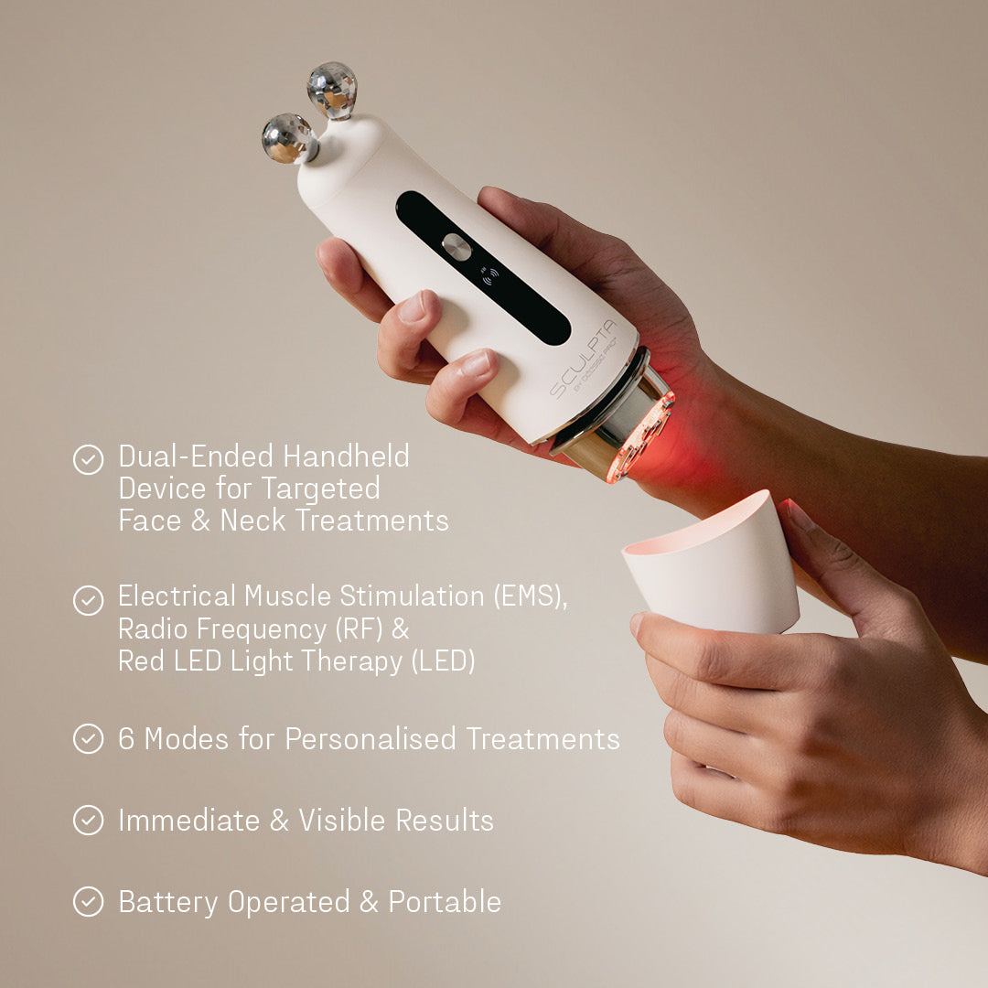 A clinic-grade dual-ended skin sculpting device that combines Red LED, RF and EMS technologies to firm, tone and redefine facial and body contours.