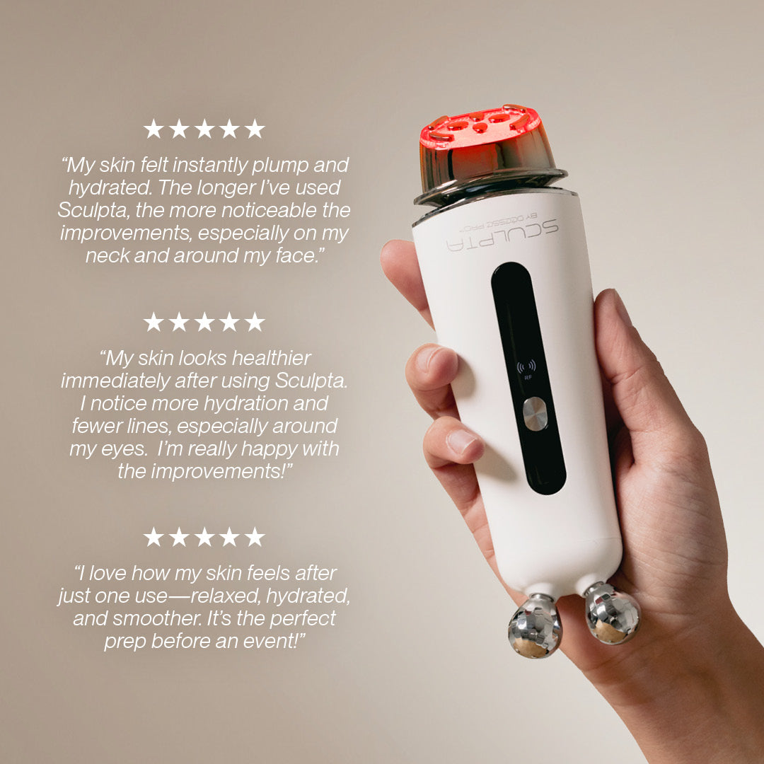 Introducing Sculpta by Déesse PRO, a breakthrough facial and body toning device powered by TriGen Technology — the synergistic combination of Electrical Muscle Stimulation (EMS), Radio Frequency (RF) and Red Light Therapy (LED). This advanced in-clinic trio works at multiple skin depths to lift, firm and renew your complexion for visible, long-term rejuvenation.